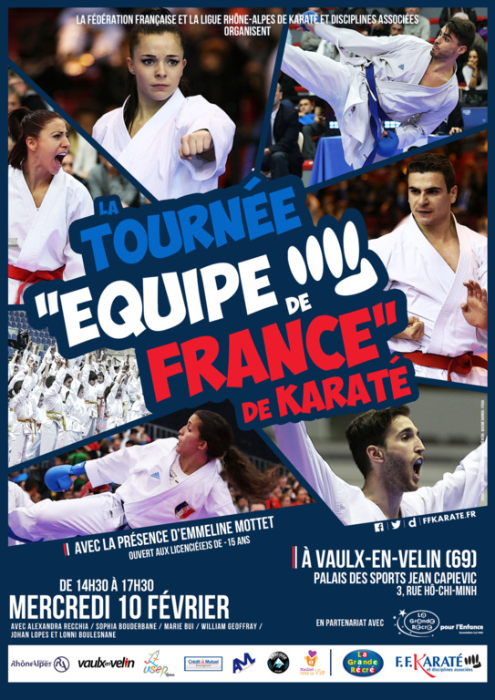Les karatékas de l’Equipe de France se rendront dans la Ligue Rhône-Alpes le mercredi 10 février prochain dans le cadre de la Tournée de l’Equipe de France. Cette deuxième étape de la Tournée des Champions, se déroulera à Vaulx-en-Velin et sera un événement sportif, mais surtout humain.